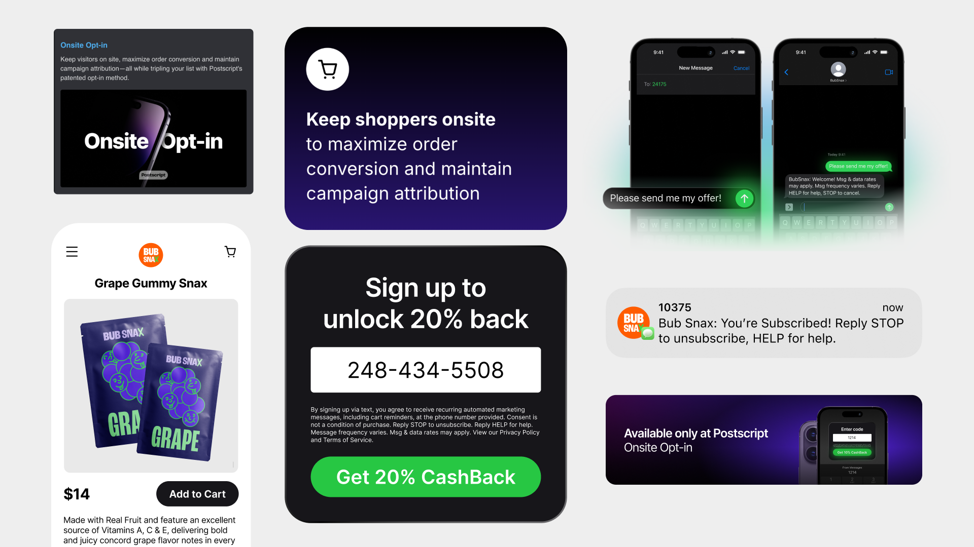 Onsite Opt-in delivers up to 3x more subscribers. Keeps visitors on site, maximizes order conversion and maintains campaign attribution—all while tripling your list with Postscript's patented opt-in method.
